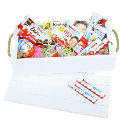 В составе деревянный ящичек нашего производства, 2 Киндер-сюрприза, 1 Киндер Джой, 3 конфеты Киндер мини, 1 Киндер со злаками, 1 Киндер Делиз, 2 Киндер Макси, 1 Киндер Т4, Киндер Т8, 2 Киндер Буэно